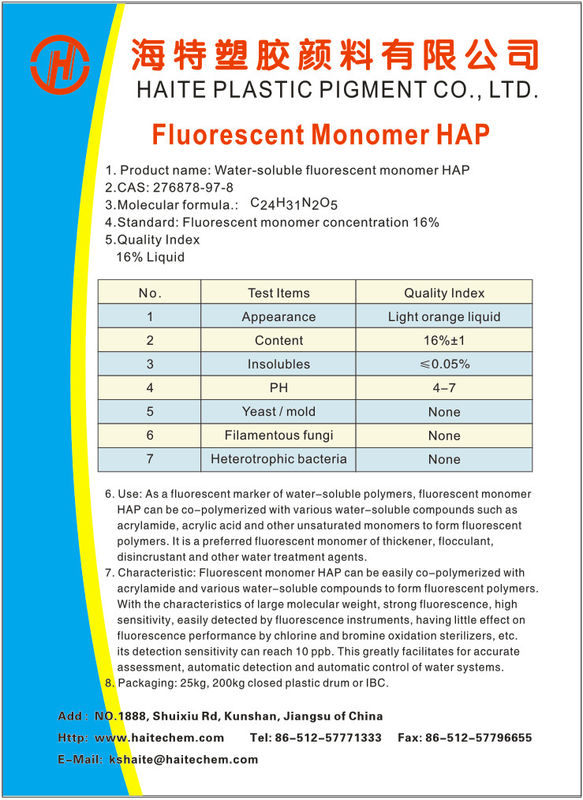 HAPNQ is bruine vloeistof met 16%-concentratie en 84%-water. Wanneer gebruikt in industriële watersystemen, kunnen de fluorescente signalen van dit geëtiketteerde polymeren worden gebruikt om te bepalen hoeveel geëtiketteerde polymeren in industriële watersystemen aanwezig zijn.